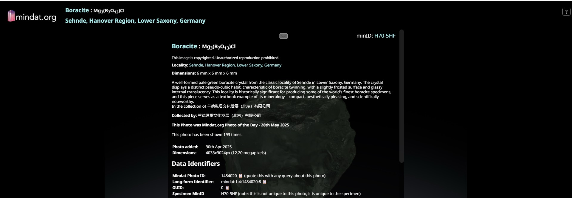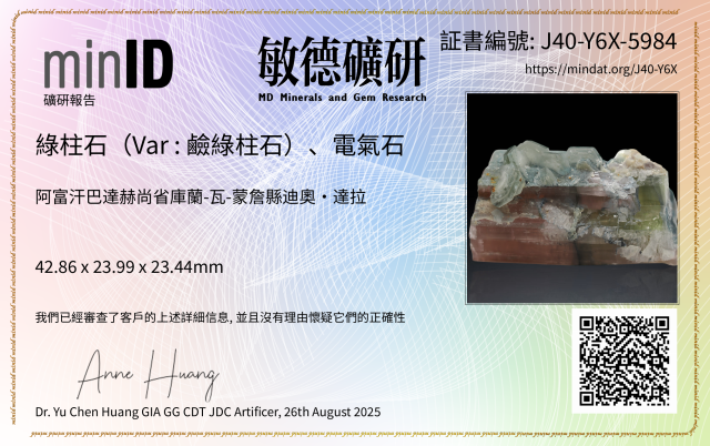 透過 minID證書,收藏者、研究人員及交易雙方皆可快速取得標本之完整資訊,並藉由唯一識別編號驗證其真實性與註冊狀態。此制度不僅提升礦物標本在收藏市場中的公信力,也為礦物學資料的保存與研究奠定堅實基礎。